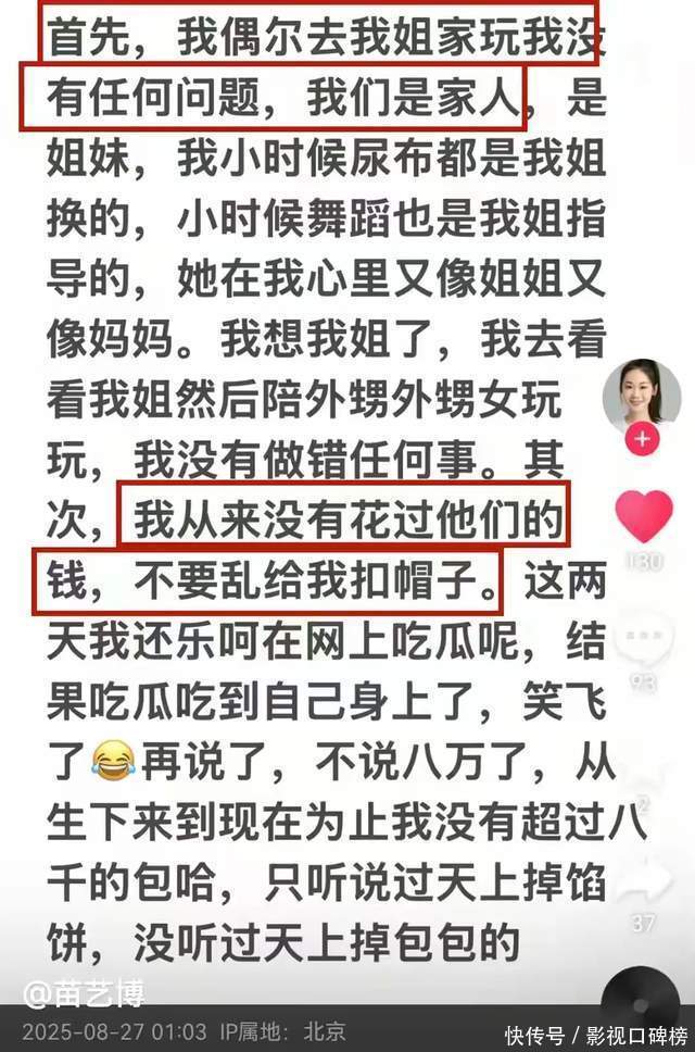 苗苗的妹妹苗艺博的评论区增加8万+恶评,本人下场直接回应八万买包被停亲属卡的传闻,她称自己和苗苗亲如母女,称“我偶尔去我姐家玩我没有任何问题”。